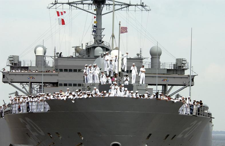 Keywords: US Navy 030613-N-6925C-013 Sailors on board the amphibious command and control ship USS Mt. Whitney (LCC-JCC 20) gather on the ship's bow, eager to see family members on the pier during homecoming celebrations.jpg en Naval Station Norfolk Va Jun 13 2003 -- Sailors on board the amphibious command and control ship USS Mt Whitney LCC/JCC 20 gather on the ship's bow eager to see family members on the pier during homecoming celebrations Mount Whitney completed a seven-month deployment as the flagship of Commander Joint Task Force Horn of Africa CJTF-HOA The most sophisticated command control communications computer and intelligence C4I ship ever commissioned Mount Whitney incorporates various elements of the most advanced C4I equipment available today Mount Whitney departed Nov 12 2002 in support of the ongoing war on terrorism and Operation Enduring Freedom U S Navy photo by Chief Photographer's Mate Thomas Coffelt RELEASED 2003-06-13 030613-N-6925C-013 Navy http //www navy mil/view_image asp id 8037 U S Navy photo by Chief Photographer's Mate Thomas Coffelt PD-USGov-Military-Navy Naval Station Norfolk Sailors coming home Aboard USS Mount Whitney LCC-20