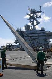 | Keywords: US Navy 030613-N-3241H-034 Flight deck personnel raise the support stanchions to position the fixed wing aircraft arrested landing emergency barricade during a simulated emergency landing drill.jpg en Philippine Sea Jun 13 2003 -- Flight deck personnel raise the support stanchions to position the fixed wing aircraft arrested landing emergency barricade during a simulated emergency landing drill The drills involve fire casualties and emergency landing situations to sharpen the readiness of flight deck personnel for the possible emergency scenarios The Carl Vinson Carrier Strike Group will remain in the Western Pacific while the forward-deployed USS Kitty Hawk CV 63 completes scheduled dry dock maintenance U S Navy photo by Photographer's Mate Airman Dustin Howell RELEASED 2003-06-13 030613-N-3241H-034 Navy http //www navy mil/view_image asp id 8065 U S Navy photo by Photographer's Mate Airman Dustin Howell PD-USGov-Military-Navy Aboard USS Kitty Hawk CV-63 Barricades aircraft carrier |