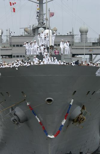 Keywords: US Navy 030613-N-6925C-001 Sailors on board the amphibious command and control ship USS Mt. Whitney (LCC-JCC 20) gather on the ship's bow, eager to see family members on the pier during homecoming celebrations.jpg en Naval Station Norfolk Va Jun 13 2003 -- Sailors on board the amphibious command and control ship USS Mt Whitney LCC/JCC 20 gather on the ship's bow eager to see family members on the pier during homecoming celebrations Mount Whitney completed a seven-month deployment as the flagship of Commander Joint Task Force Horn of Africa CJTF-HOA The most sophisticated command control communications computer and intelligence C4I ship ever commissioned Mount Whitney incorporates various elements of the most advanced C4I equipment available today Mount Whitney departed Nov 12 2002 in support of the ongoing war on terrorism and Operation Enduring Freedom U S Navy photo by Chief Photographer's Mate Thomas Coffelt RELEASED 2003-06-13 030613-N-6925C-001 Navy http //www navy mil/view_image asp id 8029 U S Navy photo by Chief Photographer's Mate Thomas Coffelt PD-USGov-Military-Navy Naval Station Norfolk Aboard USS Mount Whitney LCC-20 Front views of ships