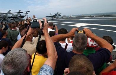 | Keywords: US Navy 030724-N-1328C-501 Crewmembers, family and friends enjoy as an F-A-18 make an arrested landing.jpg en Atlantic Ocean Jul 24 2003 - Crewmembers family and friends enjoy as an F/A-18 make an arrested landing during USS Theodore Roosevelt's CVN 71 Tiger Cruise A tiger cruise allows a Sailor s family and friends the opportunity to embark aboard U S Navy ships for a short duration underway period to experience Navy life at sea U S photo by Chief Photographer s Mate Eric A Clement RELEASED 2003-07-24 030724-N-1328C-501 Navy http //www navy mil/view_image asp id 11758 U S Navy photo PD-USGov-Military-Navy USS Theodore Roosevelt CVN-71 flight deck |