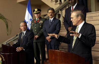 | Keywords: US Navy 030820-F-2828D-168 Secretary of Defense Donald H. Rumsfeld (right) answers a question from the media during a joint press conference with Honduran President Ricardo Maduro.jpg en Tegucigalpa Honduras Aug 20 2003 -- Secretary of Defense Donald H Rumsfeld right answers a question from the media during a joint press conference with Honduran President Ricardo Maduro left at the Presidential House in Tegucigalpa Honduras Rumsfeld is in Honduras to meet with Maduro and to thank the Honduran government for sending troops to Iraq in support of the coalition forces U S Air Force photo by Tech Sgt Andy Dunaway RELEASED 2003-08-20 030820-F-2828D-168 Navy http //www navy mil/view_image asp id 9137 U S Navy photo PD-USGov-Military-Navy Images from US Navy location Tegucigalpa Honduras Ricardo Maduro Donald Rumsfeld in 2003 |