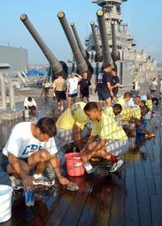 | Keywords: US Navy 030820-N-9809D-001 Chief Petty Officer selectees, from the Hampton Roads area, scrub the teak wood deck of USS Wisconsin (BB 64).jpg en Norfolk Va Aug 20 2003 -- 2003 Chief Petty Officer selectees from the Hampton Roads area scrub the teak wood deck of USS Wisconsin BB 64 in Norfolk Va as part of heritage appreciation and training prior to donning the Chief's anchors in September Wisconsin is part of a museum in downtown Norfolk Va More than 200 CPO selectees were aboard to help preserve the battleship by cleaning the teak wood deck U S Navy photo by Senior Chief Photographer's Mate Joseph Dorey RELEASED 2003-08-20 030820-N-9809D-001 Navy http //www navy mil/view_image asp id 9156 U S Navy photo by Senior Chief Photographer's Mate Joseph Dorey PD-USGov-Military-Navy Battleship Wisconsin museum ship |