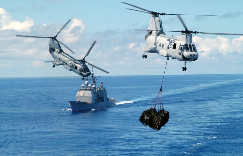 | Keywords: US Navy 030903-N-2009B-105 Two CH-46D Sea Knights transport cargo.jpg en Pacific Ocean Sep 3 2003 -- As the guided missile cruiser USS Antietam CG 54 sails in the background as two CH-46D Sea Knights assigned to the Gunbearers of Helicopter Support Squardron Eleven HC-11 transport cargo from the fast combat support ship USS Sacramento AOE 1 to USS Carl Vinson CVN 70 during vertical repenishment VERTREP The ships are part of Carl Vinson Strike Group which will remain in the western Pacific during the maintenance period for the forward deployed USS Kitty Hawk CV 63 U S Navy Photo by Photographer's Mate Airman Bridgette Beaudion RELEASED 2003-09-03 030903-N-2009B-105 Navy http //www navy mil/view_image asp id 9332 U S Navy Photo by Photographer's Mate Airman Bridgette Beaudion PD-USGov-Military-Navy CH-46 helihoisting cargo USS Antietam CG-54 CH-46D Sea Knight Helicopter Combat Support Squadron 11 United States Navy |