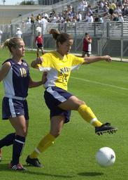 | Keywords: US Navy 030907-N-9693M-002 Navy forward Stacy Finley controls the ball while under pressure from Drexel midfielder Casey Miller during a soccer game at the U.S. Naval Academy's Glenn Warner Soccer Facility.jpg en U S Naval Academy Sep 7 2003 -- Navy forward Stacy Finley controls the ball while under pressure from Drexel midfielder Casey Miller during a soccer game at the U S Naval Academy's Glenn Warner Soccer Facility Finley scored two goals during the game which brought her career score to 100-points She is only the third Navy women's soccer player to reach the milestone The Midshipmen defeated the Dragon's 5-2 with five second half goals bringing their 2003 record to 4-0 The Navy s women soccer team has gone 30 consecutive regular-season games without a loss They hope to mark a new NCAA attendance record for women's soccer when they host the 16-time national champion University of North Carolina Sept 26 at Navy-Marine Corps Memorial Stadium in Annapolis Md U S Navy photo by Photographer's Mate 2nd Class Damon J Moritz RELEASED 2003-09-07 030907-N-9693M-002 Navy http //www navy mil/view_image asp id 9419 U S Navy photo by Photographer's Mate 2nd Class Damon J Moritz PD-USGov-Military-Navy Photos taken with Nikon D1 United States Naval Academy athletics Navy-Marine Corps Memorial Stadium Drexel University athletics |