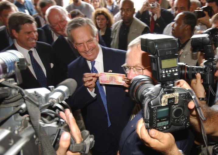| Keywords: US Navy 031015-N-4374S-007 U.S. Secretary of Commerce Don Evans displays a new Iraqi diner during a press conference.jpg en Baghdad Iraq Oct 15 2003 -- U S Secretary of Commerce Don Evans displays a new Iraqi dinar during a press conference Secretary Evans met with Iraqi leaders to talk about the progress of the economy in Iraq during his visit to Baghdad U S Navy photo by Photographer s Mate 2nd Class Michael Sandberg RELEASED 2003-10-15 031015-N-4374S-007 Navy http //www navy mil/view_image asp id 10054 U S Navy photo by Photographer s Mate 2nd Class Michael Sandberg PD-USGov-Military-Navy Baghdad in the Iraq War |