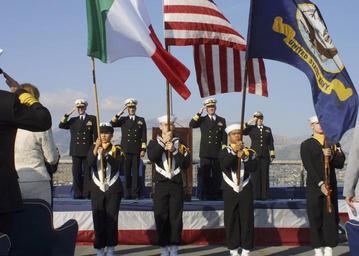 | Keywords: US Navy 031104-N-3168W-026 Guests and participants of the Commander Sixth Fleet and Striking and Support Forces South change of command salute as the colors are paraded.jpg en Gaeta Italy Nov 4 2003 -- Guests and participants of the Commander Sixth Fleet and Striking and Support Forces South change of command salute as the colors are paraded during a ceremony held aboard the Raleigh Class command ship USS La Salle AGF 3 The Italian U S and U S Navy flags were saluted as the Sixth Fleet band played the Italian and U S national anthems U S Navy photo by Journalist 3rd Class Megan M Williams RELEASED 2003-11-04 031104-N-3168W-026 Navy http //www navy mil/view_image asp id 10412 U S Navy photo by Journalist 3rd Class Megan M Williams PD-USGov-Military-Navy Personality rights Aboard USS La Salle AGF-3 Change of command Color guards of the United States Navy Military people with a flag of the United States Naval Support Activity Naples Detachment Gaeta November 2003 in Italy Photographs of military flags of the United States |