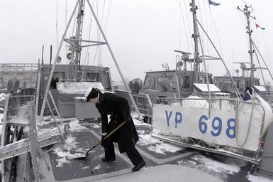| Keywords: US Navy 031206-N-0399H-002 Midshipman 4th Class Christa Stowe, from Daytona Beach, Fla., shovels snow from the weather deck of Yard Patrol Craft 698.jpg en Philadelphia Pa Dec 6 2003 -- Midshipman 4th Class Christa Stowe from Daytona Beach Fla shovels snow from the weather deck of Yard Patrol Craft 698 at Coast Guard Station Philadelphia The ship and crew are one of three Yard Patrol Crafts to make the transit from the Naval Academy in Annapolis Md to Philadelphia for the 104th playing of the Army Navy game The YPs are used to teach familiarization with water craft Basic Damage Control and underway instruction of Basic to Advanced Seamanship and Navigation Yard Patrol craft provide realistic at-sea training in navigation and seamanship for midshipmen attending the academy U S Navy photo by Photographer's Mate 1st Class Dana Howe RELEASED 2003-12-06 031206-N-0399H-002 Navy http //www navy mil/view_image asp id 10897 U S Navy photo by Photographer's Mate 1st Class Dana Howe PD-USGov-Military-Navy Images from US Navy location Philadelphia PA Yard Patrol boats |