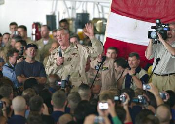 | Keywords: US Navy 031219-N-4669B-001 Joint Chiefs of Staff Chairman Gen. Richard Myers addresses the crew of USS Enterprise (CVN 65) during a holiday special.jpg en At sea aboard USS Enterprise CVN 65 Dec 19 2003 -- Joint Chiefs of Staff Chairman Gen Richard Myers addresses the crew of USS Enterprise CVN 65 during a holiday special The show was hosted by the United Service Organization USO in hangar bay one aboard the nuclear powered aircraft carrier and featured actor/comedian Robin Williams NASCAR driver Mike Wallace and World Wrestling Entertainment wrestler Kurt Angle Enterprise is underway in the Arabian Gulf conducting missions in support of Operation Iraqi Freedom and the continued war on terrorism U S Navy photo by Photographer's Mate Airman Jennifer L Brown RELEASED 2003-12-19 031219-N-4669B-001 Navy http //www navy mil/view_image asp id 11140 U S Navy photo by Photographer's Mate Airman Jennifer L Brown PD-USGov-Military-Navy Richard Myers Aboard USS Enterprise CVN-65 |