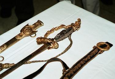 | Keywords: US Navy 040112-N-0000X-003 The historic Worden Sword rests on a table with its belt and scabbard laid out for display.jpg en Annapolis Md Jan 12 2004 -- The historic Worden Sword rests on a table with its belt and scabbard laid out for display The FBI recovered the priceless sword missing since 1931 and returned it to the U S Naval Academy The Tiffany sword was originally presented to Rear Adm John L Worden by the state of New York for his command of USS Monitor in its famous battle with CSS Virginia in Hampton Roads Va and March 9 1862 Rear Adm Worden also served as the seventh Superintendent of the U S Naval Academy U S Navy photo by Cliff Maxwell RELEASED 2004-01-12 040112-N-0000X-003 Navy http //www navy mil/view_image asp id 11347 U S Navy photo by Cliff Maxwell PD-USGov-Military-Navy United States Naval Academy Belts Swords of the United States Navy |