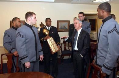 | Keywords: US Navy 040122-N-2568S-002 Cadets from the U.S. Military Academy West Point, and Midshipmen from the U.S. Naval Academy meet with the Secretary of the Navy, the Honorable Gordon R. England during the official presentation of th.jpg en Cadets from the U S Military Academy West Point and Midshipmen from the U S Naval Academy meet with the Secretary of the Navy the Honorable Gordon R England during the official presentation of the Secretary's Trophy awarded to the U S Navy Football Team following their winning 8-5 season U S Navy photo by Chief Journalist Craig P Strawser 2004-01-22 040122-N-2568S-002 Navy http //www navy mil/view_image asp id 11636 U S Navy photo by Chief Journalist Craig P Strawser PD-USGov-Military-Navy Navy Midshipmen football players Gordon R England Secretary's Trophy People receiving trophies or awards Army Black Knights football |