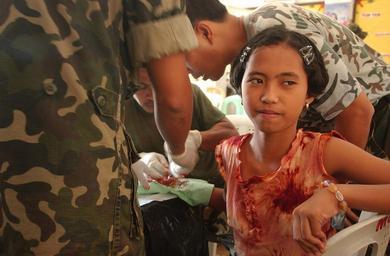 | Keywords: US Navy 040226-N-4142G-023 A young child receives medical aid from military personnel participating in the Medical Civic Action Program (MEDCAP) in Bargangay San Miguel as a part Exercise Balikatan 2004.jpg en Puerto Princesa Palawan Republic of the Philippines RP Feb 26 2004 A young child receives medical aid from military personnel participating in the Medical Civic Action Program MEDCAP in Bargangay San Miguel as a part Exercise Balikatan 2004 The MEDCAPs are staffed by the medical doctors dentists nurses and veterinarians from both the RP and U S Armed Forces and provide much needed medical and dental services to the residents of eight Barangays; Mandaragat San Miguel Model Milagrosa Sta Lourdes Irawan Luzviminda and Tiniguiban Minor surgeries tooth extraction and medicines of various sorts are also distributed among the Barangay beneficiaries This exercise is only one of a number of on-going activities under the framework of RP-US military security cooperation Other elements include assistance with comprehensive defense reform security assistance modules for counter terrorism training helicopter night capability training intelligence fusion; subject matter expert exchanges; international military education and training programs advice and support for logistics engineering equipment maintenance and civil military operations U S Navy photo by Photographer s Mate 2nd Class Felix Garza Jr RELEASED 2004-02-26 040226-N-4142G-023 Navy http //www navy mil/view_image asp id 12204 U S Navy photo by Photographer s Mate 2nd Class Felix Garza Jr PD-USGov-Military-Navy Images from US Navy location Puerto Princesa Philippines Balikatan 2004 Healthcare in the Philippines Photographs by Felix Garza Jr |