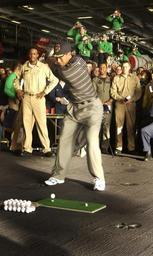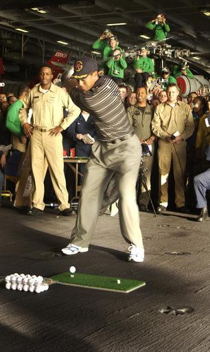 | Keywords: US Navy 040303-N-5319A-008 Sailors watch professional golfer Tiger Woods hit a few golf balls during a demonstration in the hanger bay of the nuclear powered aircraft carrier USS George Washington (CVN 73).jpg en Arabian Gulf Mar 3 2004 Sailors watch professional golfer Tiger Woods hit a few golf balls during a demonstration in the hanger bay of the nuclear powered aircraft carrier USS George Washington CVN 73 Tiger Woods accompanied by his fiancé Elin Nordegren PGA player Mark O Meara and caddies Steve Williams and Greg Rita visited the Norfolk Va Based carrier in the Arabian Gulf before participating in the European PGA Tour s Dubai Desert Classic on Thursday The George Washington Carrier Strike Group CSG and Carrier Air Wing Seven CVW-7 are deployed to the Arabian Gulf in support of Operations Iraqi and Enduring Freedom U S Navy photo by Photographer's Mate 1st Class Brien Aho RELEASED 2004-03-03 040303-N-5319A-008 Navy http //www navy mil/view_image asp id 12366 U S Navy photo by Photographer's Mate 1st Class Brien Aho PD-USGov-Military-Navy Aboard USS George Washington CVN-73 Tiger Woods in 2004 |