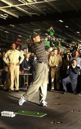 | Keywords: US Navy 040303-N-5319A-009 Sailors watch professional golfer Tiger Woods hit a few golf balls during a demonstration in the hanger bay of the nuclear powered aircraft carrier USS George Washington (CVN 73).jpg en Arabian Gulf Mar 3 2004 Sailors watch professional golfer Tiger Woods hit a few golf balls during a demonstration in the hanger bay of the nuclear powered aircraft carrier USS George Washington CVN 73 Tiger Woods accompanied by his fiancé Elin Nordegren PGA player Mark O Meara and caddies Steve Williams and Greg Rita visited the Norfolk Va Based carrier in the Arabian Gulf before participating in the European PGA Tour s Dubai Desert Classic on Thursday The George Washington Carrier Strike Group CSG and Carrier Air Wing Seven CVW-7 are deployed to the Arabian Gulf in support of Operations Iraqi and Enduring Freedom U S Navy photo by Photographer's Mate 1st Class Brien Aho RELEASED 2004-03-03 040303-N-5319A-009 Navy http //www navy mil/view_image asp id 12367 U S Navy photo by Photographer's Mate 1st Class Brien Aho PD-USGov-Military-Navy Aboard USS George Washington CVN-73 Tiger Woods in 2004 |