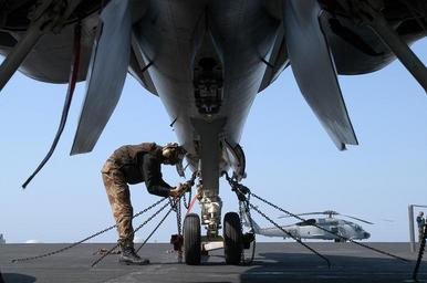 | Keywords: US Navy 040321-N-5781F-002 Plane Captain Airman Derek D. Eibensteiner, of Startell, Minn., tightens a tie-down chain on an F-A-18C Hornet assigned to the Royal Maces of Strike Fighter Squadron Two Seven (VFA-27) aboard the airc.jpg en 7th Fleet Area of Responsibility AOR Mar 21 2004 Plane Captain Airman Derek D Eibensteiner of Startell Minn tightens a tie-down chain on an F/A-18C Hornet assigned to the Royal Maces of Strike Fighter Squadron Two Seven VFA-27 aboard the aircraft carrier USS Kitty Hawk CV 63 Plane Captains take care of the aircraft assigned to them ensuring they remain in top flying condition at all times and conduct all pre-flight checks and start-ups with the Aircrew Kitty Hawk is currently underway in the 7th Fleet area of responsibility AOR and is the U S Navy s only permanently forward-deployed aircraft carrier operating from Yokosuka Japan U S Navy photo by Photographer s Mate Airman Bo J Flannigan RELEASED 2004-03-21 040321-N-5781F-002 Navy http //www navy mil/view_image asp id 12864 U S Navy photo by Photographer s Mate Airman Bo J Flannigan PD-USGov-Military-Navy F/A-18C Hornet Flight deck of USS Kitty Hawk CV-63 Strike Fighter Squadron 27 United States Navy Aircraft tie-down chains |