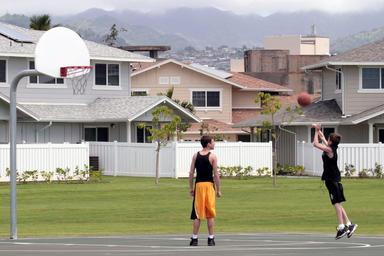 | Keywords: US Navy 040324-N-3228G-006 Navy family members enjoy a game of basketball at the new Navy housing on Ford Island.jpg en Pearl Harbor Hawaii Mar 24 2004 - Navy family members enjoy a game of basketball at the new Navy housing on Ford Island The housing development is part of a 35 million project to design and construct 140 homes on Ford Island and 30 homes at Radford Terrace The homes are three and four-bedroom units arranged as duplex and quad-buildings They feature such amenities as metal framing garages central air conditioning solar hot water systems modern kitchens with energy-saving appliances and full-size washers and dryers The new community includes a host of improvements such as underground utilities recreational areas and new roads More than 2 300 Navy family homes have been replaced or renovated on Oahu since 1996 at a cost of 426 million U S Navy photo by Photographer s Mate 1st Class William R Goodwin RELEASED 2004-03-24 040324-N-3228G-006 Navy http //www navy mil/view_image asp id 12914 U S Navy photo PD-USGov-Military-Navy Buildings at Pearl Harbor Ford Island Buildings at Joint Base Pearl Harbor-Hickam Photographs by William R Goodwin |