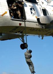 Keywords: US Navy 040408-N-8921O-012 Aircrew Survival Equipmentman 2nd Class John Mann, of San Diego, Calif., fast ropes out of a UH-3H Sea King helicopter.jpg en Oak Harbor Wash Apr 08 2004 - Aircrew Survival Equipmentman 2nd Class John Mann of San Diego Calif fast ropes out of a UH-3H Sea King helicopter Petty Officer Mann is assigned to Explosive Ordnance Disposal Mobile Unit Eleven EODMU-11 The unit is conducting fast rope and rappelling exercises to help prepare the team for combat situations U S Navy photo by Photographer's Mate Airman Chris Otsen RELEASED 2004-04-08 040408-N-8921O-012 Navy http //www navy mil/view_image asp id 13172 U S Navy photo by Photographer's Mate Airman Chris Otsen PD-USGov-Military-Navy Naval Air Station Whidbey Island United States Navy Explosive Ordnance Disposal Aircrew Survival Equipmentman Fast roping UH-3H Sea King Explosive Ordnance Disposal Mobile Unit 11