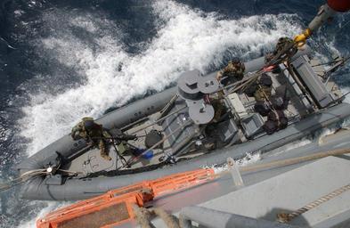 Keywords: US Navy 040421-N-7586B-017 Members from Special Boat Team Twelve (SBT-12) make final preparations to a Rigid Hull Inflatable Boat (RHIB).jpg en Gulf of Oman Apr 21 2004 - Members from Special Boat Team Twelve SBT-12 make final preparations to a Rigid Hull Inflatable Boat RHIB as it is lowered into the water from the flight deck of USS Whidbey Island LSD 41 during Operation Enduring Freedom OEF The amphibious dock landing Ship Whidbey Island is deployed to the U S Central Command Area of Operation to support the Global War on Terrorism U S Navy photo by Photographer s Mate First Class Bart Bauer RELEASED 2004-04-21 040421-N-7586B-017 Navy http //www navy mil/view_image asp id 13607 U S Navy photo by Photographer s Mate First Class Bart Bauer PD-USGov-Military-Navy Rigid-hulled inflatable boats of US Navy Aboard USS Whidbey Island LSD-41 Special Warfare Combatant-craft Crewmen Special Boat Team 12