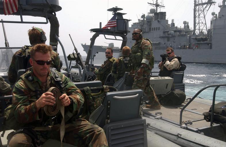 | Keywords: US Navy 040421-N-7586B-027 Sailors assigned to Special Boat Team Twelve (SBT-12) make final preparations to their Rigid Hull Inflatable Boats (RHIB).jpg en Gulf of Oman Apr 21 2004 - Sailors assigned to Special Boat Team Twelve SBT-12 make final preparations to their Rigid Hull Inflatable Boats RHIB after being lowered to the water from the flight deck of USS Whidbey Island LSD 41 as USS Leyte Gulf CG 55 cruises in the background The amphibious dock landing Ship Whidbey Island and Ticonderoga-class guided missile cruiser Leyte Gulf are participating in Operation Enduring Freedom OEF while deployed to the U S Central Command Area of Operation supporting the Global War on Terrorism U S Navy photo by Photographer s Mate 1st Class Bart Bauer RELEASED 2004-04-21 040421-N-7586B-027 Navy http //www navy mil/view_image asp id 13608 U S Navy photo by Photographer s Mate 1st Class Bart Bauer PD-USGov-Military-Navy Rigid-hulled inflatable boats of US Navy USS Leyte Gulf CG-55 Special Warfare Combatant-craft Crewmen Special Boat Team 12 |