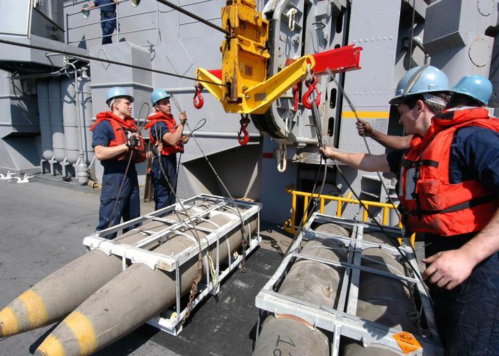 Keywords: US Navy 040423-N-4190W-011 Deck department personnel aboard the fast combat support ship USS Seattle (AOE 3) transport ammunition to USS John F. Kennedy (CV 67).jpg en Atlantic Ocean Apr 23 2004 - Deck department personnel aboard the fast combat support ship USS Seattle AOE 3 transport ammunition to USS John F Kennedy CV 67 during an underway replenishment Kennedy is making final preparations before deploying on a scheduled six-month deployment to the Mediterranean Sea U S Navy photo by Photographer's Mate 3rd Class Chris Weibull RELEASED 2004-04-23 040423-N-4190W-011 Navy http //www navy mil/view_image asp id 13615 U S Navy photo by Photographer's Mate 3rd Class Chris Weibull PD-USGov-Military-Navy Cargo in transfer underway replenishment Aboard USS John F Kennedy CV-67