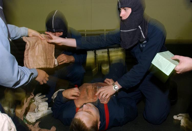 | Keywords: US Navy 040428-N-4757S-004 Journalist 2nd Class Christopher Johnson practices dresses a simulated chest wound, while practicing emergency first aid procedures.jpg en Atlantic Ocean Apr 28 2004 - Journalist 2nd Class Christopher Johnson practices dresses a simulated chest wound while practicing emergency first aid procedures during a General Quarters drill in the ship's hangar bay aboard the aircraft carrier USS Harry S Truman CVN 75 Truman is currently undergoing a Tailored Ship's Training Availability TSTA exercise off the Atlantic coast U S Navy photo by Photographer's Mate Airman Craig R Spiering RELEASED 2004-04-28 040428-N-4757S-004 Navy http //www navy mil/view_image asp id 13780 U S Navy photo by Photographer's Mate Airman Craig R Spiering PD-USGov-Military-Navy Aboard USS Harry S Truman CVN-75 First aid training |