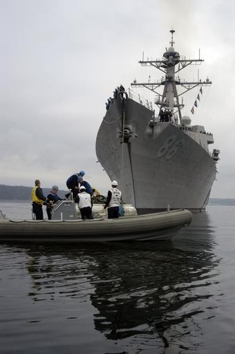 Keywords: US Navy 040513-N-6477M-087 The crew of a Rigid Hull Inflatable Boat (RHIB) assigned to the guided missile destroyer USS Shoup (DDG 86) assist with mooring the ship to a buoy.jpg en Puget Sound Wash May 13 2004 - The crew of a Rigid Hull Inflatable Boat RHIB assigned to the guided missile destroyer USS Shoup DDG 86 assist with mooring the ship to a buoy Shoup transited along the coast of Washington to conduct a series of drills including man overboard engineering casualty small arms fire and mooring to a buoy U S Navy photo by Photographer's Mate 2nd Class Eli J Medellin RELEASED 2004-05-13 040513-N-6477M-087 Navy http //www navy mil/view_image asp id 14109 U S Navy photo by Photographer's Mate 2nd Class Eli J Medellin PD-USGov-Military-Navy Puget Sound USS Shoup DDG-86 Rigid-hulled inflatable boats of US Navy Man overboard drills