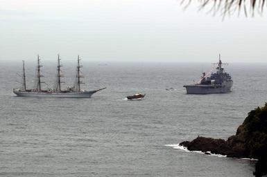 | Keywords: US Navy 040514-N-1194D-014 The Japanese tall ship Nippon Maru and the U.S. Navy^rsquo,s command ship USS Coronado (AGF 11) anchor just outside Shimoda.jpg en The Japanese tall ship Nippon Maru and the U S Navy's command ship USS Coronado AGF 11 anchor just outside Shimoda during the 65th Shimoda Black Ship Festival The Seventh Fleet amphibious command ship Coronado steamed from it s forward deployed location in Yokosuka Japan for the three-day celebration The festival promotes the theme of peaceful relations between the Japanese and American people and commemorates the 1854 landing of Commodore Matthew Perry and the signing of the Japanese-American treaty of trade and amity at Shimoda This year's festival commemorates the 150th anniversary of that landing 2004-05-14 http //www navy mil/view_image asp id 14155 U S Navy/Journalist 2nd Class Patrick Dille 040514-N-1194D-014 Navy http //www navy mil/view_image asp id 14155 PD-USGov-Military-Navy Shimoda Black Ship Festival USS Coronado AGF-11 Nippon Maru ship 1984 Photographs by Patrick Dille |