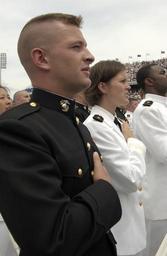 | Keywords: US Navy 040528-N-9693M-022 A new 2nd Lt., left, and a new Ensign sing the U.S. Naval Academy alma mater ^ldquo,Navy Blue And Gold^rdquo, during the U.S. Naval Academy class of 2004 graduation and commissioning ceremony.jpg en U S Naval Academy May 28 2004 - A new 2nd Lt left and a new Ensign sing the U S Naval Academy alma mater Navy Blue And Gold during the U S Naval Academy class of 2004 graduation and commissioning ceremony Recently the U S Naval Academy changed the lyrics to better reflect the makeup of Midshipmen attending the Academy The new lyrics replace the two references to men The song begins Now colleges from sea to sea may sing of colors true and the third line has been changed to For Sailors brave in battle fair since fighting days of old Nine hundred-ninety Midshipmen graduated from the U S Naval Academy and became commissioned officers in the U S Military Chairman of the Joint Chiefs of Staff Gen Richard B Myers delivered the commencement address and personally greeted each graduate during the ceremony The men and women of the graduating class were sworn into the Navy as Ensigns or into the Marine Corps as Second Lieutenants U S Navy photo by Photographer's Mate 2nd Class Damon J Moritz RELEASED 2004-05-28 040528-N-9693M-022 Navy http //www navy mil/view_image asp id 14490 U S Navy photo by Photographer's Mate 2nd Class Damon J Moritz PD-USGov-Military-Navy Graduation and Commissioning Ceremony May 28 2004 Taken with Nikon D1X |
