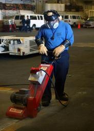 | Keywords: US Navy 040601-N-9319H-030 Airman Armando Zarco, of Turlock, Calif., removes non-skid from a weapons elevator door in the hangar bay.jpg en South Atlantic Ocean Jun 1 2004 - Airman Armando Zarco of Turlock Calif removes non-skid from a weapons elevator door in the hangar bay aboard the aircraft carrier USS Ronald Reagan CVN 76 Reagan is underway circumnavigating South America on her way to her new homeport of San Diego Calif U S Navy photo by Photographer's Mate 3rd Class Angel G Hilbrands RELEASED 2004-06-01 040601-N-9319H-030 Navy http //www navy mil/view_image asp id 14671 U S Navy photo by Photographer's Mate 3rd Class Angel G Hilbrands PD-USGov-Military-Navy Hangar bays of USS Ronald Reagan CVN-76 Weapons elevators of USS Ronald Reagan CVN-76 |