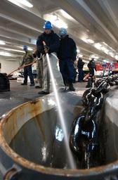 | Keywords: US Navy 040621-N-7711S-056 Deck department crew members aboard USS Ronald Reagan (CVN 76) conduct a fresh water rinse on one of the ship^rsquo,s anchor chains.jpg en Pacific Ocean June 21 2004 - Deck department crew members aboard USS Ronald Reagan CVN 76 conduct a fresh water rinse on one of the ship s anchor chains while preparing to get underway Reagan is underway circumnavigating South America in transit to her new homeport of San Diego Calif while participating in exercises supporting Summer Pulse 2004 Summer Pulse 2004 is the simultaneous deployment of seven aircraft strike groups CSGs demonstrating the ability of the Navy to provide credible combat across the globe in five theaters with other U S allied and coalition military forces Summer Pulse is the Navy s first deployment under its new Fleet Response Plan FRP U S Navy photo by Photographer's Mate Airman Recruit Christine Singh RELEASED For more information go to <a href http //www cffc navy mil/summerpulse04 htm Target _BLANK >www cffc navy mil/summerpulse04 htm</a> 2004-06-21 040621-N-7711S-056 Navy http //www navy mil/view_image asp id 15713 U S Navy photo by Photographer's Mate Airman Recruit Christine Singh PD-USGov-Military-Navy Forecastle of USS Ronald Reagan CVN-76 Anchor chains |