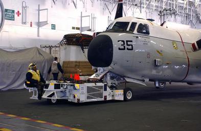 | Keywords: US Navy 040623-N-9319H-070 Aviation Boatswain^rsquo,s Mate 2nd Class Sheronda Seabrook, from Greenville, S.C., re-spots a C-2A Greyhound.jpg en Pacific Ocean June 23 2004 - Aviation Boatswain s Mate 2nd Class Sheronda Seabrook from Greenville S C re-spots a C-2A Greyhound assigned to the Providers of Fleet Logistics Support Squadron Three Zero VRC-30 in the hangar bay aboard USS Ronald Reagan CVN 76 Reagan is underway circumnavigating South America in transit to her new homeport of San Diego Calif while participating in exercises supporting Summer Pulse 2004 Summer Pulse 2004 is the simultaneous deployment of seven aircraft strike groups CSGs demonstrating the ability of the Navy to provide credible combat across the globe in five theaters with other U S allied and coalition military forces Summer Pulse is the Navy s first deployment under its new Fleet Response Plan FRP U S Navy photo by Photographer's Mate 3rd Class Angel G Hilbrands RELEASED For more information go to <a href http //www cffc navy mil/summerpulse04 htm Target _BLANK >www cffc navy mil/summerpulse04 htm</a> 2004-06-23 040623-N-9319H-070 Navy http //www navy mil/view_image asp id 15714 U S Navy photo by Photographer's Mate 3rd Class Angel G Hilbrands PD-USGov-Military-Navy Hangar bays of USS Ronald Reagan CVN-76 Grumman C-2 Greyhound Fleet Logistics Support Squadron 30 United States Navy |