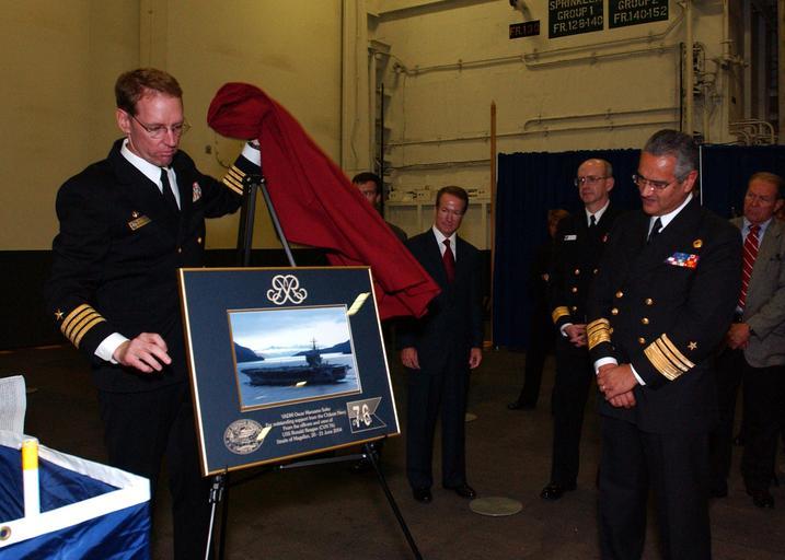 Keywords: US Navy 040626-N-2788L-071 USS Ronald Reagan (CVN 76) Commanding Officer, Capt. James Symonds, presents a photograph of the ship while transiting the Straits of Magellan, to Chilean Navy Vice Adm. Oscar Manzano Soko.jpg en Pacific Ocean June 26 2004 - USS Ronald Reagan CVN 76 Commanding Officer Capt James Symonds presents a photograph of the ship while transiting the Straits of Magellan to Chilean Navy Vice Adm Oscar Manzano Soko Reagan is underway circumnavigating South America in transit to her new homeport of San Diego Calif while participating in exercises supporting Summer Pulse 2004 Summer Pulse 2004 is the simultaneous deployment of seven aircraft strike groups CSGs demonstrating the ability of the Navy to provide credible combat across the globe in five theaters with other U S allied and coalition military forces Summer Pulse is the Navy s first deployment under its new Fleet Response Plan FRP U S Navy photo by Photographer's Mate Airman Paul H Laverty Jr RELEASED For more information go to <a href http //www cffc navy mil/summerpulse04 htm Target _BLANK >www cffc navy mil/summerpulse04 htm</a> 2004-06-26 040626-N-2788L-071 Navy http //www navy mil/view_image asp id 15716 U S Navy photo by Photographer's Mate Airman Paul H Laverty Jr PD-USGov-Military-Navy James Symonds Guests aboard USS Ronald Reagan CVN-76 Admirals of Chile |