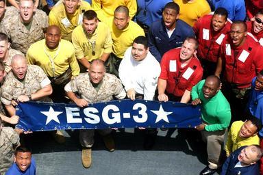 | Keywords: US Navy 040702-N-3714J-002 Commander, Expeditionary Strike Group Three ESG-3, Brig. Gen. Joseph V. Medina, left of white shirt, Commanding Officer, USS Belleau Wood LHA 3.jpg en Arabian Gulf July 2 2004 - Commander Expeditionary Strike Group Three ESG-3 Brig Gen Joseph V Medina left of white shirt Commanding Officer USS Belleau Wood LHA 3 Capt Earl L Gay green shirt Belleau Wood Sailors and Marines from the special operations capable 11th Marine Expeditionary Unit MEU show their support while filming a Spirit Spot for the Army/Navy football game scheduled later this year The Belleau Wood Expeditionary Strike Group Three ESG-3 is comprised of the amphibious transport dock ship USS Denver LPD 9 amphibious dock landing ship USS Comstock LSD 45 guided missile destroyers USS Hopper DDG 70 and USS Preble DDG 88 guided missile cruiser USS Mobile Bay CG 53 and fast-attack submarine USS Charlotte SSN 766 and elements of the 11th Marine Expeditionary Unit MEU special operations capable SOC ESG forces provide a national defense asset capable of conducting sustained combat operations and humanitarian assistance from sea or shore ESG-3 is currently deployed in support of the global war on terrorism U S Navy photo by Photographer s Mate 3rd Class Erika N Jones RELEASED 2004-07-02 040702-N-3714J-002 Navy http //www navy mil/view_image asp id 15855 U S Navy photo by Photographer s Mate 3rd Class Erika N Jones PD-USGov-Military-Navy Aboard USS Belleau Wood LHA-3 Earl L Gay |