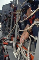 | Keywords: US Navy 040715-N-5862D-244 Boatswain's Mate 3rd Class Ben Gozales from Salt Lake City, Utah, secures the pilots ladder on the port side of the ship while inport at Naval Station Pascagoula, Miss.jpg en Pascagoula Miss July 15 2004 - Boatswain's Mate 3rd Class Ben Gozales from Salt Lake City Utah secures the pilots ladder on the port side of the ship while inport at Naval Station Pascagoula Miss Gonzales is assigned to the deck department aboard the Navy's newest Arleigh Burke-class guided missile destroyer USS Chung-Hoon DDG 93 Chung-Hoon is making preparations to depart the Pascagoula shipyard and steam towards her new homeport in Pearl Harbor Hawaii where she will be officially commissioned later this year U S Navy photo by Chief Photographer's Mate Chris Desmond RELEASED 2004-07-15 040715-N-5862D-244 Navy http //www navy mil/view_image asp id 16534 U S Navy photo by Chief Photographer's Mate Chris Desmond PD-USGov-Military-Navy Aboard Chung-Hoon DDG-93 Naval Station Pascagoula |