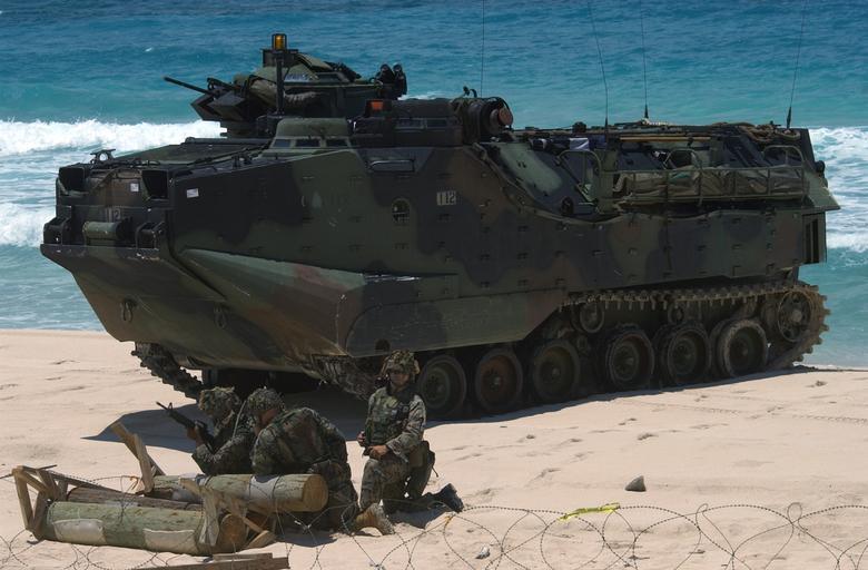 | Keywords: US Navy 040718-N-5055W-002 U.S. Marines assigned to 3rd Battalion, 3rd Marine Regiment guard their Amphibious Assault Vehicle.jpg en Marine Corps Base Hawaii July 18 2004 - U S Marines assigned to 3rd Battalion 3rd Marine Regiment guard their Amphibious Assault Vehicle AAV following a mechanized raid in support of exercise Rim of the Pacific RIMPAC 2004 RIMPAC is the largest international maritime exercise in the waters around the Hawaiian Islands This year's exercise includes seven participating nations; Australia Canada Chile Japan South Korea the United Kingdom and the United States RIMPAC is intended to enhance the tactical proficiency of participating units in a wide array of combined operations at sea while enhancing stability in the Pacific Rim region U S Navy photo by Photographer's Mate 1st Class Jane West RELEASED For more information go to <a href http //www cpf navy mil/RIMPAC2004 Target _BLANK >http //www cpf navy mil/RIMPAC2004</a>/ http //www navy mil/view_image asp id 16334 Photographer's Mate 1st Class Jane West 2004-07-18 PD-USGov-Military-Navy 3d Bn 3d Mar 2004 RIMPAC Marine Corps Base Hawaii Amphibious Assault Vehicle |