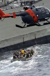 | Keywords: US Navy 040720-N-1464F-007 A boarding team from USS Thomas S. Gates (CG 51) rides a Rigid Hull Inflatable Boat (RHIB) as it prepares to conduct a boarding of a foreign amphibious ship during Pacific Phase exercises of UNITAS 4.jpg en Pacific Ocean July 20 2004 - A boarding team from USS Thomas S Gates CG 51 rides a Rigid Hull Inflatable Boat RHIB as it prepares to conduct a boarding of a foreign amphibious ship during Pacific Phase exercises of UNITAS 45-04 A Chilean helicopter flies nearby to observe the boarding operations Naval forces from Argentina Chile Colombia Ecuador Peru and observers from Mexico and Canada are participating in UNITAS 45-04 UNITAS is the premier naval exercise in the region conducted under the direction of Commander U S Naval Forces Southern Command and hosted this year by the Peruvian Navy UNITAS is designed to develop interoperability among the participating navies while increasing readiness and providing the training in a high-tech environment U S Navy photo by Chief Journalist Dave Fliesen RELEASED 2004-07-20 040720-N-1464F-007 Navy http //www navy mil/view_image asp id 16711 U S Navy photo by Chief Journalist Dave Fliesen PD-USGov-Military-Navy USS Thomas S Gates CG-51 |