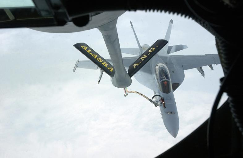 Keywords: US Navy 040721-F-3488S-005 A Navy F-A-18F Super Hornet assigned to the Black Aces of Strike Fighter Squadron Four One (VFA-41) home based at NAS Lemoore, Calif., is refueled by a KC-135R Stratotanker.jpg en Eielson Air Force Base Alaska July 21 2004 - A Navy F/A-18F Super Hornet assigned to the Black Aces of Strike Fighter Squadron Four One VFA-41 home based at NAS Lemoore Calif is refueled by a KC-135R Stratotanker assigned to the 168th Air Refueling Wing Alaska Air National Guard during exercise Cooperative Cope Thunder 2004-01 Cope Thunder is a multi-service multi-platform coordinated combat operations exercise U S Air Force photo by Senior Airman Joshua Strang RELEASED 2004-07-21 040721-F-3488S-005 Navy http //www navy mil/view_image asp id 16389 U S Navy photo PD-USGov-Military-Navy Eielson Air Force Base Cooperative Cope Thunder Aerial refueling by KC-135 Stratotanker as seen from tanker F/A-18F Super Hornet in flight Aerial refueling of F/A-18F Super Hornet Strike Fighter Squadron 41 United States Navy |