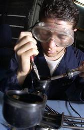 | Keywords: US Navy 040721-N-1485H-022 Interior Communications Technician Fireman Manuel Garciacasanova of North Plainfield, N.J., repairs a sound-powered telephone aboard USS Kitty Hawk (CV 63).jpg en Pacific Ocean July 21 2004 - Interior Communications Technician Fireman Manuel Garciacasanova of North Plainfield N J repairs a sound-powered telephone aboard USS Kitty Hawk CV 63 Sound-powered telephones are utilized aboard all Navy ships as an alternate means of communication to the electrical telephone or two-way radio Powered by the energy generated from the user's voice sound-powered telephones are commonly used by watch standers lookouts and in the event of power loss They have been in service since before WWII Interior communications technicians are responsible of all shipboard interior communications systems aboard Navy ships Kitty Hawk is one of seven carrier strike groups CSGs involved in Summer Pulse 2004 Summer Pulse 2004 is the simultaneous deployment of seven carrier strike groups CSGs demonstrating the ability of the Navy to provide credible combat capability across the globe in five theaters with other U S allied and coalition military forces U S Navy photo by Photographer's Mate 3rd Class Lamel J Hinton RELEASED For more information go to <a href http //www cffc navy mil/summerpulse04 htm Target _BLANK >www cffc navy mil/summerpulse04 htm</a> 2004-07-21 040721-N-1485H-022 Navy http //www navy mil/view_image asp id 16397 U S Navy photo by Photographer's Mate 3rd Class Lamel J Hinton PD-USGov-Military-Navy Aboard USS Kitty Hawk CV-63 People of the United States Navy with sound-powered telephones |