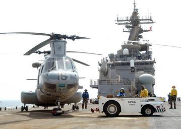 | Keywords: US Navy 040724-N-6380E-081 A CH-46 Sea Knight helicopter assigned to the Fighting Griffins of Marine Helicopter Medium Squadron Two Six Six.jpg en Indian Ocean July 24 2004 - A CH-46 Sea Knight helicopter assigned to the Fighting Griffins of Marine Helicopter Medium Squadron Two Six Six HMM-266 is towed on the flight deck of the amphibious assault ship USS Wasp LHD 1 HMM-266 is the Aircraft Combat Element of the 22nd Marine Expeditionary Unit MEU Special Operations Capable as they return to the flight deck of the amphibious assault ship USS Wasp LHD 1 The 22nd MEU is part of the Wasp Expeditionary Strike Group two ESG-2 and are currently on deployment in support of Operation Iraqi Freedom OIF U S Navy photo by Photographer s Mate 3rd Class Teresa Ellison RELEASED 2004-07-24 040724-N-6380E-081 Navy http //www navy mil/view_image asp id 16836 U S Navy photo by Photographer s Mate 3rd Class Teresa Ellison PD-USGov-Military-Navy CH-46 US Marine Corps USS Wasp LHD-1 flight deck |