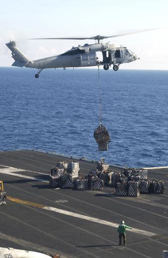 | Keywords: US Navy 040806-N-1485H-015 An MH-60 Knight Hawk helicopter assigned to Helicopter Anti-submarine Squadron (HS-14) transfers supplies.jpg  en Pacific Ocean Aug 6 2004 - An MH-60 Knight Hawk helicopter assigned to Helicopter Anti-submarine Squadron HS-14 transfers supplies from the Military Sealift Command combat stores ship USNS Concord T-AFS 3 to the flight deck aboard the aircraft carrier USS Kitty Hawk CV 63 during a replenishment-at-sea RAS evolution The Kitty Hawk Carrier Strike Group is one of seven carrier strike groups CSGs involved in Summer Pulse 2004 demonstrating the Navy's ability to provide credible combat power across the globe in five theaters with other U S allied and coalition military forces Summer Pulse is the Navy's first test of its new Fleet Response Plan FRP Kitty Hawk is the world's only permanently forward-deployed aircraft carrier home based in Yokosuka Japan U S Navy photo by Photographer's Mate 3rd Class Lamel J Hinton RELEASED For more information go to <a href http //www cffc navy mil/summerpulse04 htm Target _BLANK >www cffc navy mil/summerpulse04 htm</a> 2004-08-06 040806-N-1485H-015 Navy http //www navy mil/view_image asp id 16881 U S Navy photo by Photographer's Mate 3rd Class Lamel J Hinton PD-USGov-Military-Navy MH-60S helihoisting cargo Helicopter Anti-Submarine Squadron 14 United States Navy Flight deck of USS Kitty Hawk CV-63  |
