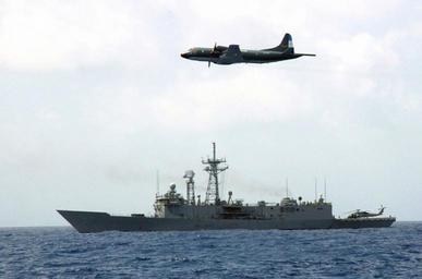 | Keywords: US Navy 040813-N-0507C-001 The guided missile frigate USS Crommelin (FFG 37) and an Argentinean P-3 aircraft patrol the northern approach to the Panama Canal.jpg en Gulf of Panama Aug 13 2004 The guided missile frigate USS Crommelin FFG 37 and an Argentinean P-3 aircraft patrol the northern approach to the Panama Canal in search of a suspect vessel in support of PANAMAX 2004 Naval forces from eight countries are participating in PANAMAX 2004 a naval exercise designed to build up a coalition response to security threats against the Panama Canal PANAMAX is conducted under the direction of Commander Naval Forces Southern Command and involves the identification monitoring and interdiction of vessels posing a simulated terrorist threat to the Canal The multinational force includes surface and air assets from Argentina Colombia Chile Dominican Republic Honduras Panama Peru and the United States operating in the north and south approaches to the Canal PANAMAX s realistic scenario develops not only interoperability among naval forces but also joint and inter-agency interoperability as the naval forces work together with other services and agencies of Panama to ensure the safety of the Canal and to protect freedom of navigation U S Navy photo by Lt Ligia Cohen RELEASED 2004-08-13 040813-N-0507C-001 Navy http //www navy mil/view_image asp id 17075 U S Navy photo by Lt Ligia Cohen PD-USGov-Military-Navy United States Navy in the Gulf of Panama PANAMAX 2004 P-3 Orion of the navy of Argentina USS Crommelin FFG-37 |