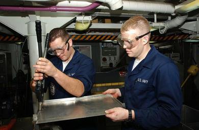 | Keywords: US Navy 040818-N-7232R-008 Hull Technician Fireman Glen Reese and Firman Joe Giovanni of Longlot repair an aluminum lid.jpg en Western Pacific Ocean Aug 18 2004 - Hull Technician Fireman Glen Reese of Preston Idaho and Firman Joe Giovanni of Longlot Colo assigned to the Sheet Metal Shop aboard the aircraft carrier USS John C Stennis CVN 74 repairs an aluminum lid Stennis and Carrier Air Wing Fourteen CVW-14 are at sea on a regularly scheduled deployment conducting exercises in the Western Pacific U S Navy photo by Photographer's Mate Airman Ryan J Restvedt RELEASED 2004-08-18 040818-N-7232R-008 Navy http //www navy mil/view_image asp id 17121 U S Navy photo by Photographer's Mate Airman Ryan J Restvedt PD-USGov-Military-Navy Aboard USS John C Stennis CVN-74 |