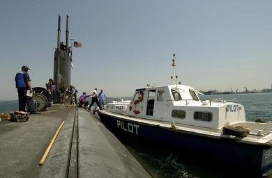 | Keywords: US Navy 040831-N-1348L-030 A Bahraini harbor pilot is escorted onto his boat after assisting the crew of the Los Angeles-class attack submarine USS Toledo (SSN 769) through the shallow waters of Mina Sulman port.jpg en Arabian Gulf Aug 31 2004 - A Bahraini harbor pilot is escorted onto his boat after assisting the crew of the Los Angeles-class attack submarine USS Toledo SSN 769 through the shallow waters of Mina Sulman port after a 10-day port visit to the Kingdom of Bahrain Harbor pilots are used by U S Naval vessels to aid in navigating in and out of unfamiliar bodies of water The crew used the port visit as a working port to perform a mid-deployment upkeep Toledo is part of USS John F Kennedy CV 67 Carrier Strike Group CSG and is on a deployment in support of the sovereign Iraqi government U S Navy photo by Photographer's Mate 1st Class David C Lloyd RELEASED 2004-08-31 040831-N-1348L-030 Navy http //www navy mil/view_image asp id 17499 U S Navy photo by Photographer's Mate 1st Class David C Lloyd PD-USGov-Military-Navy USS Toledo SSN-769 Pilot boats |
