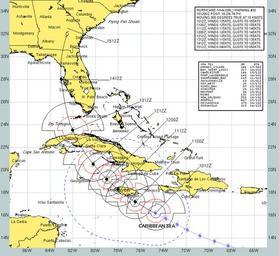| Keywords: US Navy 040910-N-0000W-001 Current forecast projected path and wind speeds of Hurricane Ivan from Sept 10 to Sept 15.jpg en Caribbean Sea Sept 10 2004 Current forecast projected path and wind speeds of Hurricane Ivan from Sept 10 to Sept 15 Ivan an extremely dangerous category four hurricane on the Saffir-Simpson Hurricane scale has maximum sustained winds near 145 mph with higher gusts Hurricane force winds extend outward up to 60 miles from the center and tropical storm force winds extend outward up to 175 miles The well-defined eye of hurricane Ivan was located about 85 miles south-southeast of Kingston Jamaica Hurricane Ivan has killed at least 32 people in Grenada Tobago and Venezuela as it barrels toward Jamaica and possibly the Florida Keys Photo provided by Naval Atlantic Meteorology and Oceanography Center RELEASED For more information visit <a href https //weather navy mil Target _BLANK >https //weather navy mil</a> 2004-09-10 040910-N-0000W-001 Navy http //www navy mil/view_image asp id 17579 U S Navy photo PD-USGov-Military-Navy Hurricane Ivan |