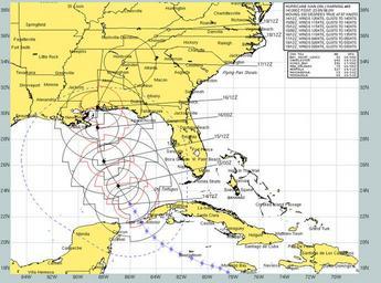 | Keywords: US Navy 040914-N-0000X-003 Current forecast projected path and wind speeds of Hurricane Ivan from Sept 14 to Sept 19.jpg en Caribbean Sea Sept 14 2004 Current forecast projected path and wind speeds of Hurricane Ivan from Sept 14 to Sept 19 Ivan an extremely dangerous category four hurricane on the Saffir-Simpson Hurricane scale has maximum sustained winds near 140 mph with higher gusts Hurricane force winds extend outward up to 100 miles from the center and tropical storm force winds extend outward up to 260 miles The well-defined eye of hurricane Ivan was located about 405 miles south-southeast of the mouth of the Mississippi River Hurricane Ivan has killed at least 65 people in the Caribbean and it now poses a threat to the Florida panhandle and the Gulf Coast States Photo provided by Naval Atlantic Meteorology and Oceanography Center RELEASED For more information visit <a href https //weather navy mil Target _BLANK >https //weather navy mil</a> 2004-09-14 040914-N-0000X-003 Navy http //www navy mil/view_image asp id 17643 U S Navy photo PD-USGov-Military-Navy Hurricane Ivan |