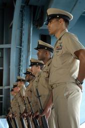 | Keywords: US Navy 040914-N-8090G-002 Chief petty officers (CPO) stand at parade rest prior to a 21-gun salute during a White Hat burial at sea ceremony.jpg en Arabian Gulf Sept 14 2004 - Chief petty officers CPO stand at parade rest prior to a 21-gun salute during a White Hat burial at sea ceremony aboard the conventionally powered aircraft carrier USS John F Kennedy CV 67 The ceremony is one of the final steps in the transitions the CPO Selects go through prior to their inaugural pinning Kennedy and embarked Carrier Air Wing Seventeen CVW-17 are currently on deployment to the 5th Fleet area of responsibility AOR in support of Operation Iraqi Freedom OIF Units in the Kennedy Carrier Strike Group are working closely with Multi-National Corps-Iraq and Iraqi forces to bring stability to the sovereign government of Iraq U S Navy photo by Photographer s Mate Airman Nicholas Garratt RELEASED 2004-09-14 040914-N-8090G-002 Navy http //www navy mil/view_image asp id 17659 U S Navy photo by Photographer s Mate Airman Nicholas Garratt PD-USGov-Military-Navy Aboard USS John F Kennedy CV-67 Sea burials 21 gun salute |