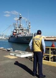 | Keywords: US Navy 040920-N-0106C-003 A line handler watches as the Safeguard-class rescue and salvage ship USS Salvor (ARS 52) pulls into Naval Station Pearl Harbor.jpg en Pearl Harbor Hawaii Sept 20 2004 - A line handler watches as the Safeguard-class rescue and salvage ship USS Salvor ARS 52 pulls into Naval Station Pearl Harbor following a deployment to the Western Pacific The Salvor with a crew of more than 100 officers and Sailors left Hawaii May 3 to participate in exercise Cooperation Afloat Readiness and Training CARAT 2004 CARAT is a regularly scheduled series of bilateral military training exercises with Singapore Thailand Malaysia Brunei and the Philippines The exercises are designed to enhance the combat readiness of the respective sea services U S Navy photo by Journalist 1st Class Daniel J Calderón RELEASED 2004-09-20 040920-N-0106C-003 Navy http //www navy mil/view_image asp id 17780 U S Navy photo by Journalist 1st Class Daniel J Calderón PD-USGov-Military-Navy 2004 in Pearl Harbor USNS Salvor T-ARS-52 at Pearl Harbor |