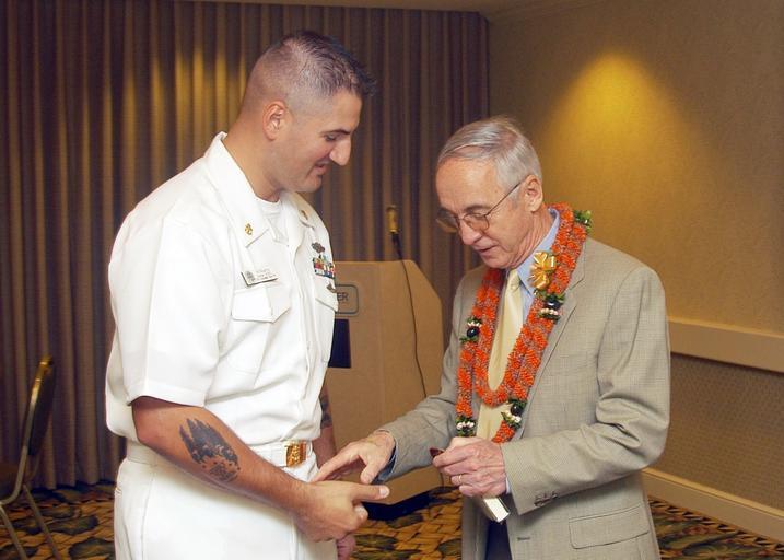 | Keywords: US Navy 041013-N-6775N-014 Chief Sonar Technician Mark Williams presents a command challenge coin to Secretary of the Navy, the Honorable Gordon R. England.jpg en Waikiki Hawaii Oct 13 2004 - Chief Sonar Technician Mark Williams presents a command challenge coin to Secretary of the Navy the Honorable Gordon R England at the 2004 Navy Birthday Breakfast sponsored by the Honolulu Council Navy League Chief Williams of Sydney Maine is currently assigned to the Los-Angeles-class attack submarine USS Columbia SSN 771 U S Navy photo by Photographer's Mate 2nd Class Justin P Nesbitt RELEASED 2004-10-13 041013-N-6775N-014 Navy http //www navy mil/view_image asp id 18191 U S Navy photo by Photographer's Mate 2nd Class Justin P Nesbitt PD-USGov-Military-Navy Images from US Navy location Waikiki Hawaii USS Columbia SSN-771 Challenge coins Gordon R England Men with arm tattoos |