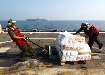 | Keywords: US Navy 041112-N-4374S-007 Sailors assigned to the Proud Warriors of Helicopter Anti-Submarine Squadron Light Four Two (HSL-42), move a pallet of stores across the flight deck of the guided missile cruiser USS Vicksburg (CG 69).jpg en Arabian Gulf Nov 12 2004 - Sailors assigned to the Proud Warriors of Helicopter Anti-Submarine Squadron Light Four Two HSL-42 move a pallet of stores across the flight deck of the guided missile cruiser USS Vicksburg CG 69 during a vertical replenishment VERTREP with the Military Sealift Command MSC combat stores ship USNS Saturn T-AFS 10 Vicksburg is part of USS John F Kennedy CV 67 Carrier Strike Group currently on a regularly scheduled deployment in support of Operation Iraqi Freedom OIF U S Navy photo by Photographer s Mate 2nd Class Michael Sandberg RELEASED 2004-11-12 041112-N-4374S-007 Navy http //www navy mil/view_image asp id 18843 U S Navy photo by Photographer s Mate 2nd Class Michael Sandberg PD-USGov-Military-Navy Aboard USS Vicksburg CG-69 Pallet jacks |