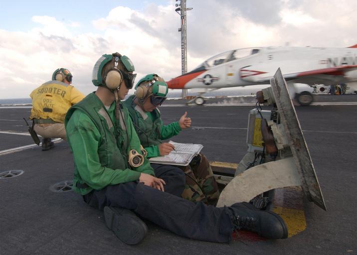 | Keywords: US Navy 041113-N-1045B-004 Flight deck crew launch a T-45 ^ldquo,Goshawk^rdquo, assigned to Training Wing One (TW-1) while Aviation Boatswain^rsquo,s Mates monitor the steam pressure of the ship's catapults aboard USS George W.jpg en Atlantic Ocean Nov 13 2004 Flight deck crew launch a T-45 Goshawk assigned to Training Wing One TW-1 while Aviation Boatswain s Mates monitor the steam pressure of the ship's catapults aboard USS George Washington CVN 73 The Norfolk Va -based Nimitz-class aircraft carrier is conducting routine training off the East Coast of the United States U S Navy photo by Photographer's Mate Airman Michael D Blackwell II RELEASED 2004-11-13 041113-N-1045B-004 Navy http //www navy mil/view_image asp id 18882 U S Navy photo by Photographer's Mate Airman Michael D Blackwell II PD-USGov-Military-Navy Aboard USS George Washington CVN-73 McDonnell Douglas T-45 Goshawk |