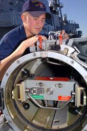 | Keywords: US Navy 041201-N-0685S-003 Sonar Technician 2nd Class Christopher A. Gentleman of Mesa, Ariz., performs maintenance on a MK-32 Surface Vessel Torpedo Tube aboard the guided missile destroyer USS Milius (DDG 69).jpg en San Diego Calif Dec 1 2004 - Sonar Technician 2nd Class Christopher A Gentleman of Mesa Ariz performs maintenance on a MK-32 Surface Vessel Torpedo Tube aboard the guided missile destroyer USS Milius DDG 69 Milius is preparing for a scheduled deployment in the support of Global War on Terrorism U S Navy photo by Photographer's Mate 3rd Class Jo A Wilbourn Sims RELEASED 2004-12-01 041201-N-0685S-003 Navy http //www navy mil/view_image asp id 19418 U S Navy photo by Photographer's Mate 3rd Class Jo A Wilbourn Sims PD-USGov-Military-Navy USS Milius DDG-69 |